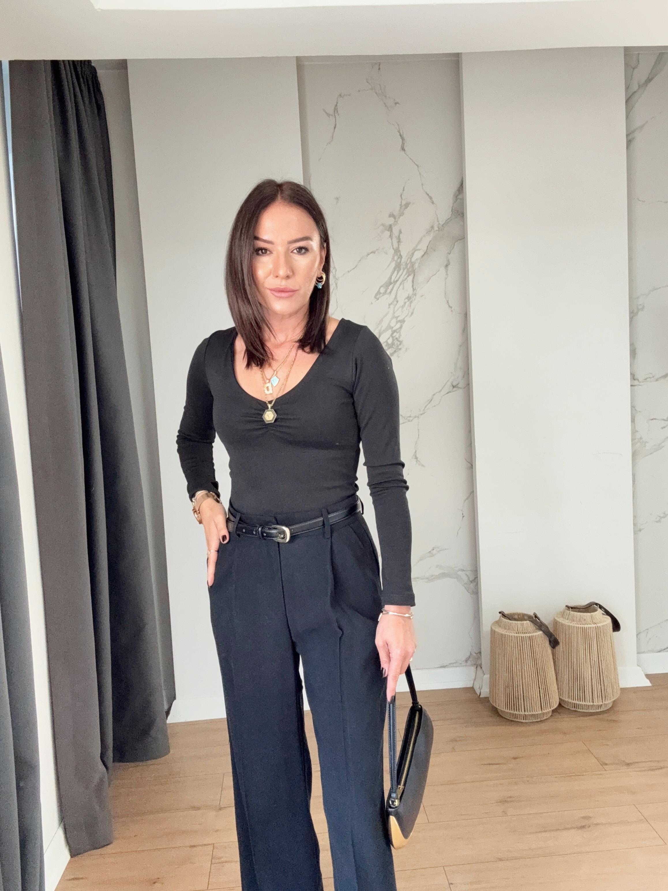 Büzgü Detaylı V Yaka Bluz SİYAH