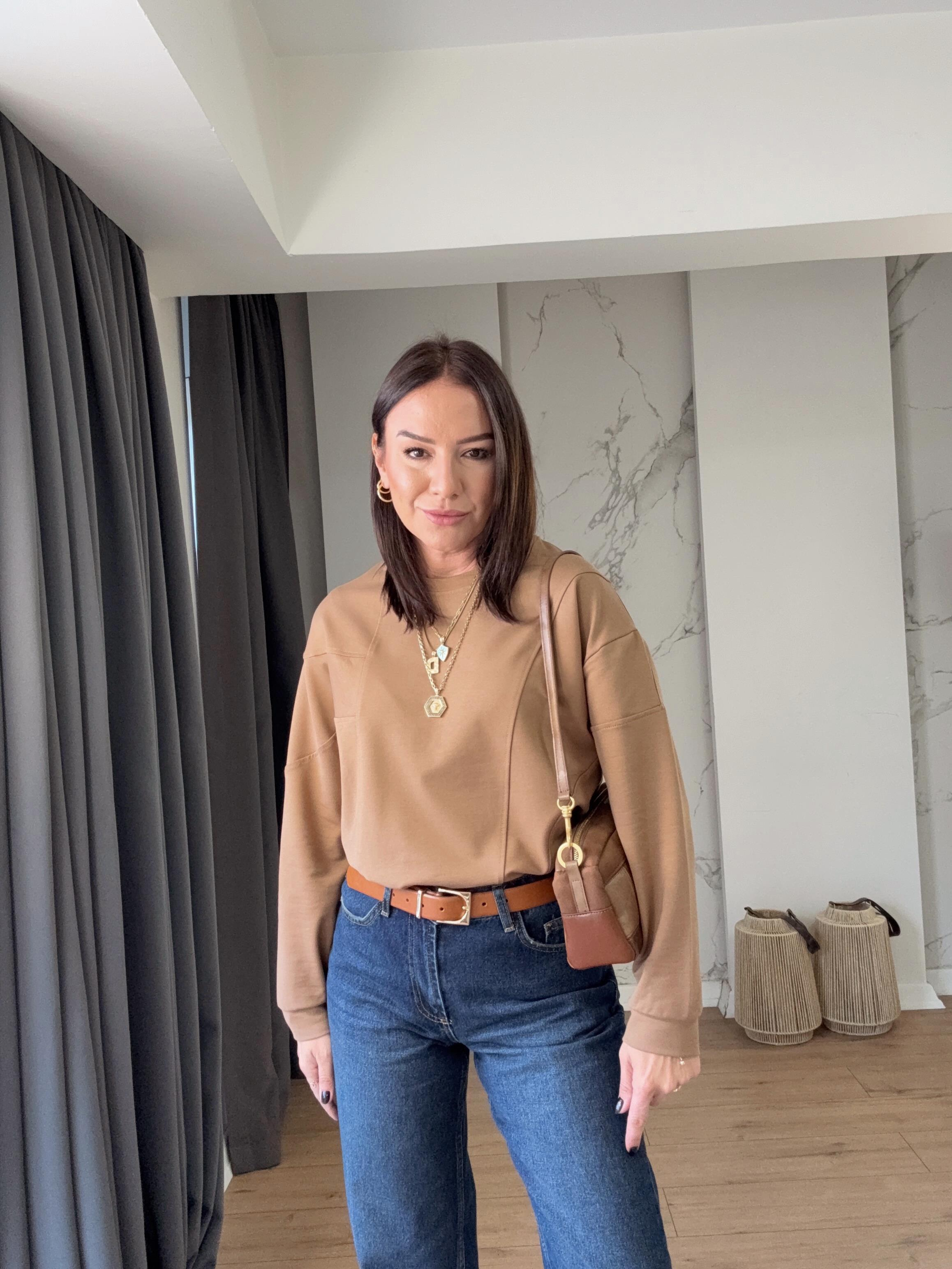 Dikiş Detaylı Bisiklet Yaka Sweat CAMEL