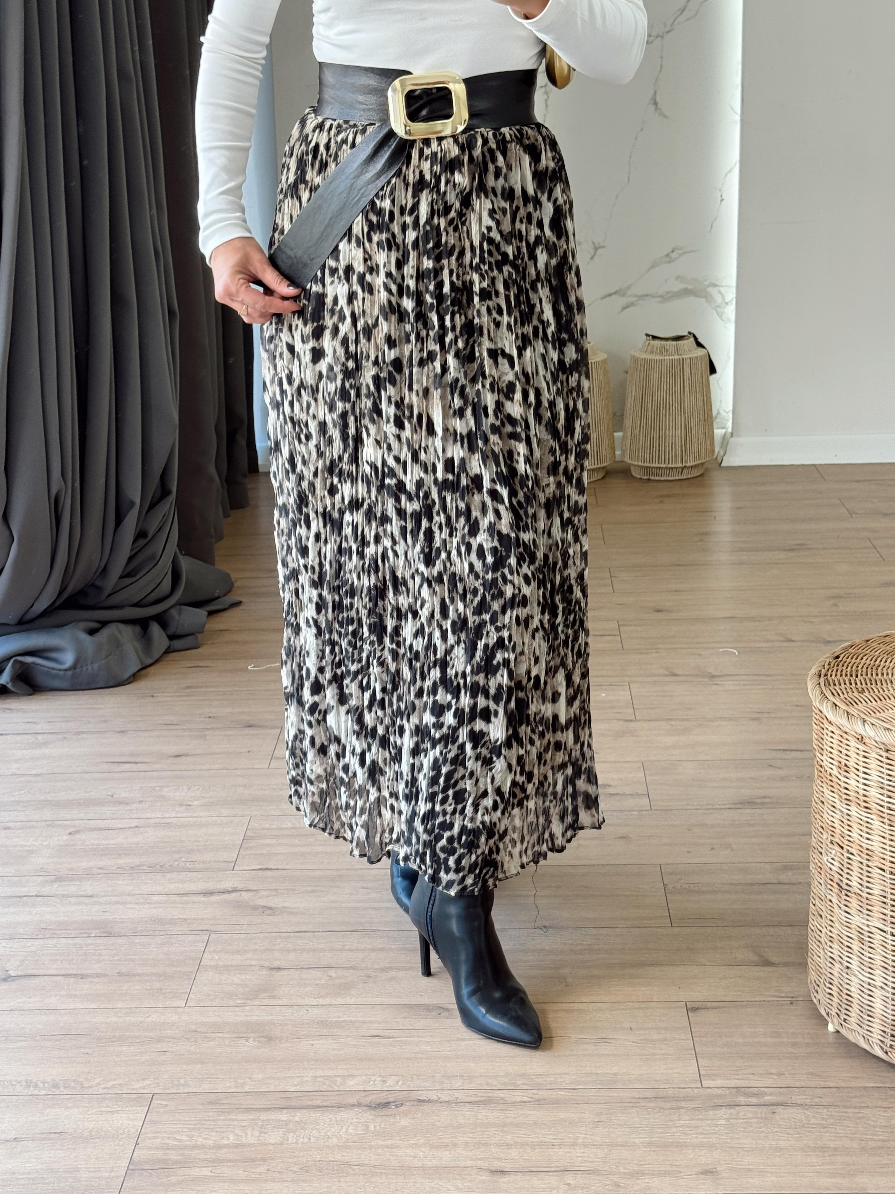 Leopar Desen Kraşlı Kemerli Etek SİYAH