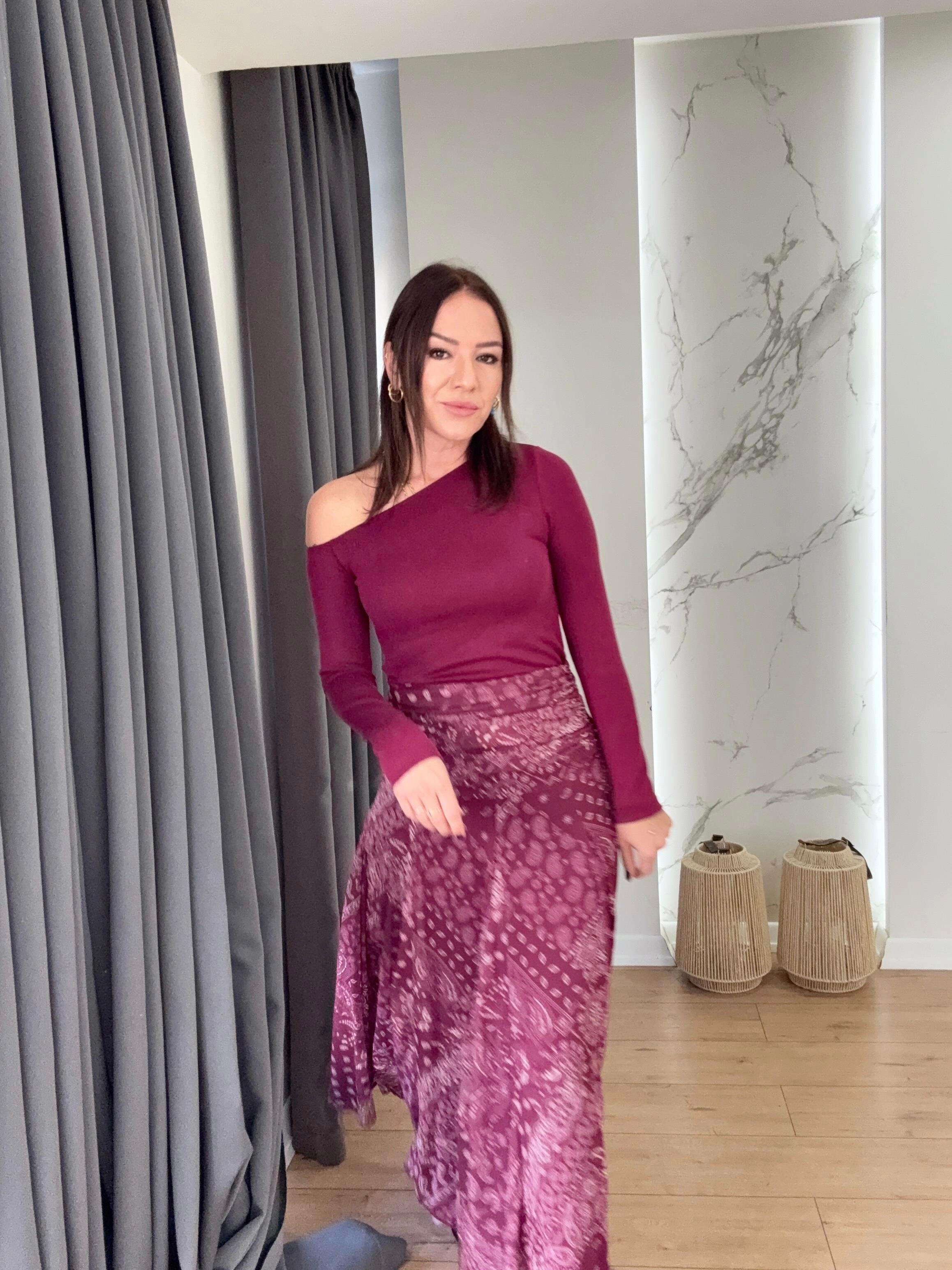 Şal Desen Yanı Fermuarlı Etek BORDO