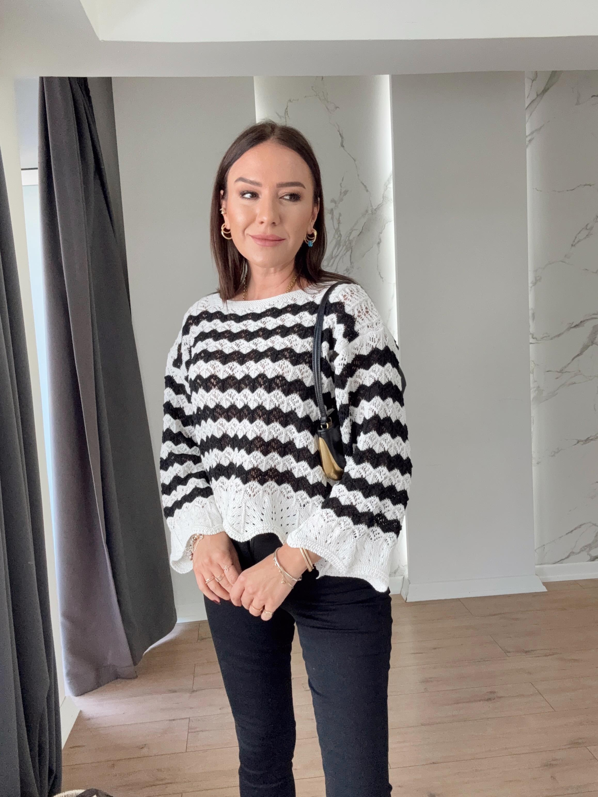 Zigzag Desenli Ajurlu Triko SİYAH BEYAZ